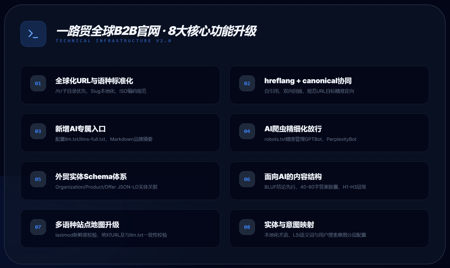 多语种 GEO 网站升级:升级多语种 GEO 网站,让全球 AI 理解并认可你的专业实力,突破语言壁垒,覆盖更广阔的国际市场,占据流量先发优势。